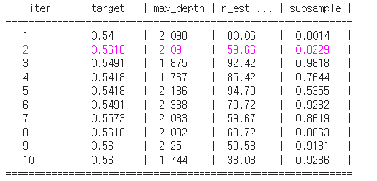 BO_lgbm.maximize(init_points=5,n_iter=5)