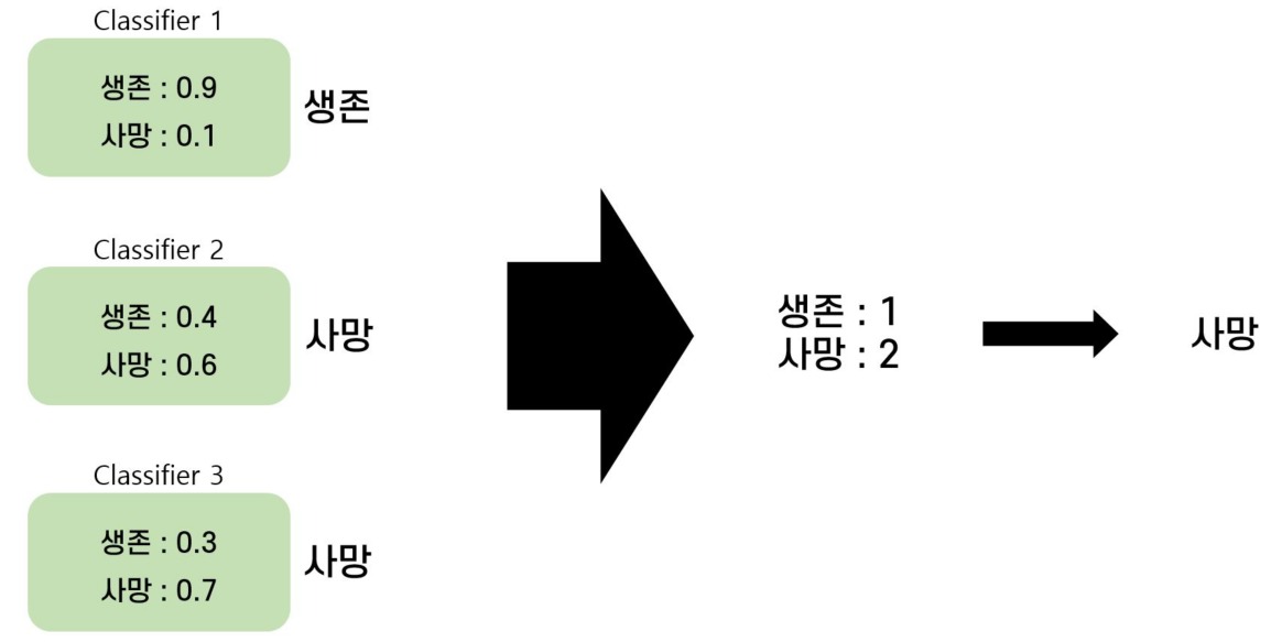 아주 간단한 예로 모델이 총 3개로 1번 모델, 2번 모델의 결과가 사과로 나왔다. 3번 모델의 결과는 배로 나왔으면 사과가 2표, 배가 1표이므로 이 것의 결과는 사과가 된다.