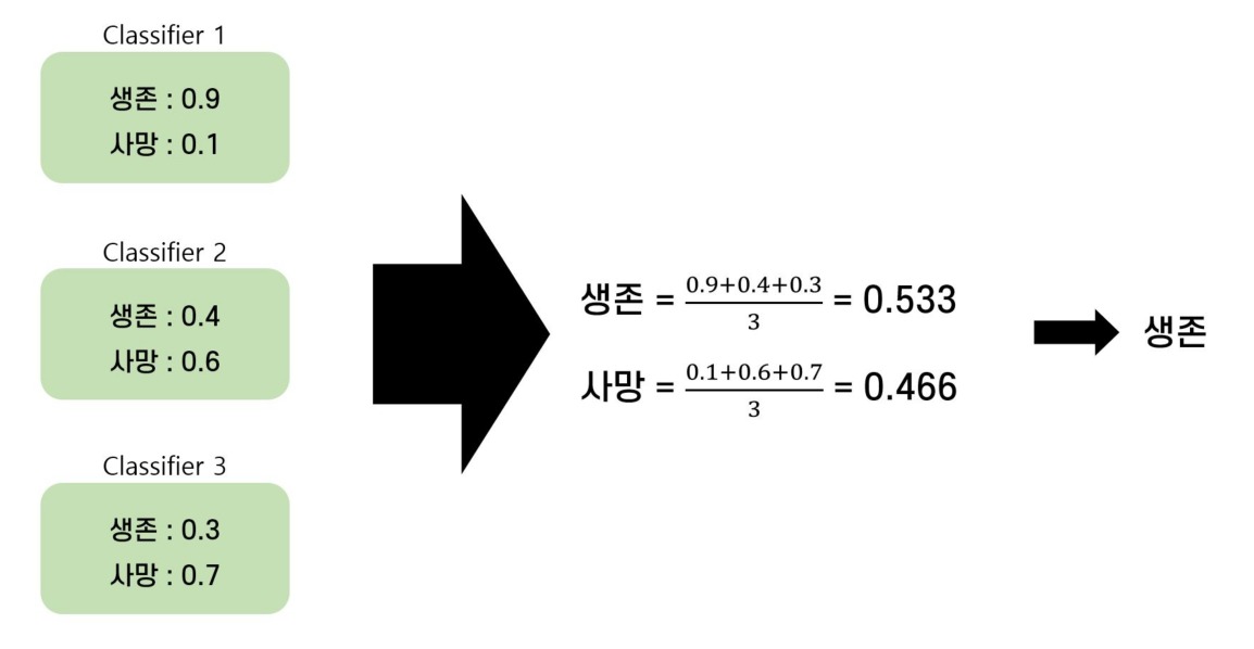 - Probability Voting이라고도 하며, 각 모델들이 예측한 결과값이 아닌! 결과값의 확률을 합산해 최종 예측 결과를 선정하다. 단순히 예측 결과만 고려하지 않고 높은 확률을 반환하는 모델의 비중이 들어가기에 Hard voting보다 성능이 좋다.