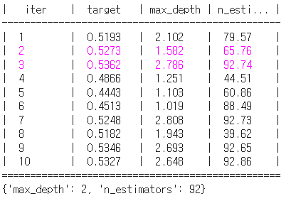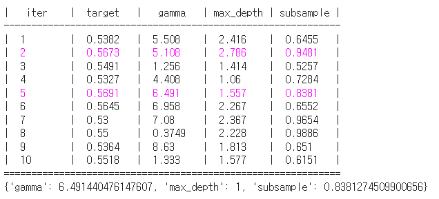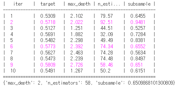BO_xgb.maximize(init_points=5,n_iter=5)