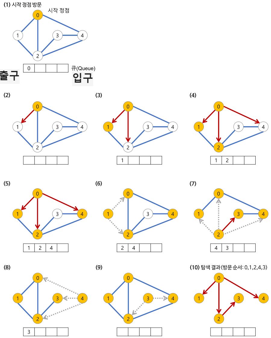 (10). 최종적으로 탐색 순서는 0 -> 1 -> 2 -> 3 -> 4 가 된다.