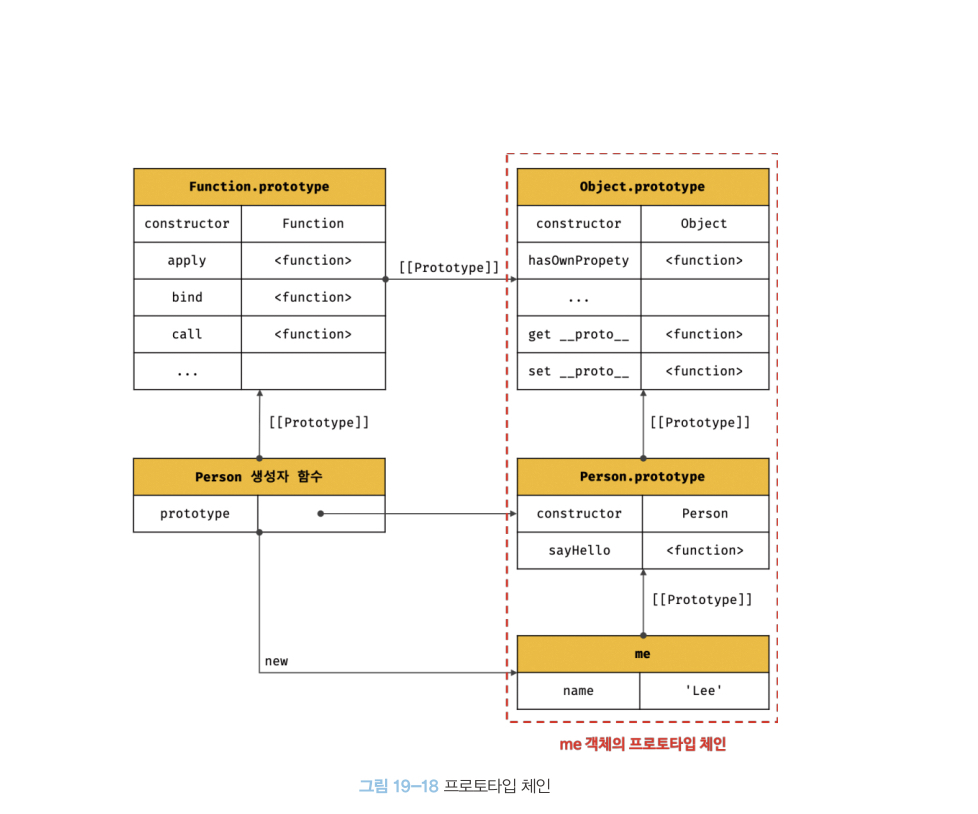 - 이를 프로토타입 체인이라 불르며 상위 객체의 프로퍼티를 가지고와서 쓸 수 있다.
