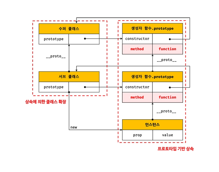 - 자바 언어처럼 클래스에서 extends키워드를 사용하여 부모클래스를 상속받으면 자식 클래스는 부모 클래스의 프로토타입을 상속받는다. 즉 부모클래스.프로토타입을 상속 받는 자식클래스.프로토타입이 또하나 생성된다. 이렇게 자식클래스로 인스턴스를 생성하면 프로토타입 체인에 의해 부모클래스의 프로퍼티까지 사용할 수 있게 되었다.