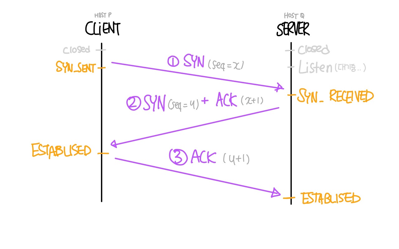 (여기서 seq는 Sequence Number로 랜덤값을 부여해서 서버단에 보낸다.) - 서버는 SYN(seq=x)이란 연결요청을 수락했다는 것을 클라이언트에 알려주기 위해 너가 보낸 SYN(x)에 1을 추가하여 ACK(x+1)이란 이름으로 보내주고 너의 포트도 오픈해줘란 요청을 위해 SYN(seq=y)값을 같이 보내준다.
