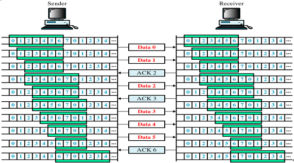 - 3. 수신자는 자신이 받고 처리한 패킷의 수만큼 윈도우를 옆으로 옮겨 준다. 그 후 옆으로 옮긴 윈도우의 제일 앞단 위치를 ACK와 함께 송신자에게 보낸다.