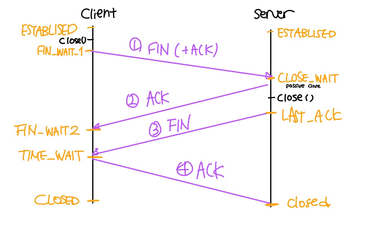 - 클라이언트가 close()메서드를 호출하면 FIN(ACK포함해서) 플래그를 서버단으로 보낸다.