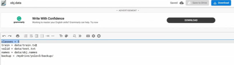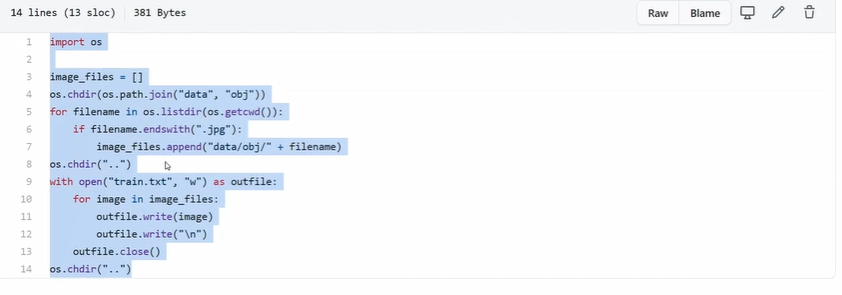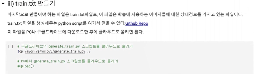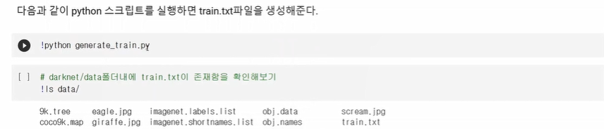 colab에서 이 generate_train.py을 돌리면 train.txt파일이 생성되고 그 안에는 한줄마다 이미지의 경로가 적힌 것을 볼 수 있다.