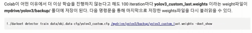 학습을 하다 중간에 끊기면 저장해놨던 weight값을 darknet53.conv.74자리에 넣어주면 됨.