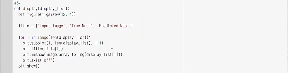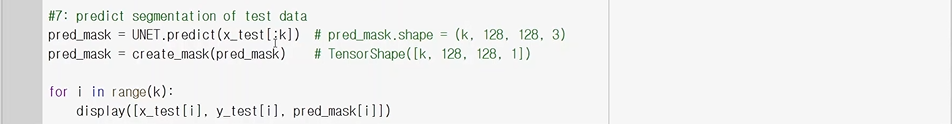display함수를 써서 원래 영상과 y_test(ground truth)와 pred_mask를 비교한다)