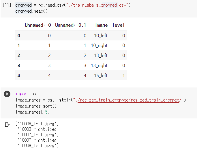 df안에 cropped를 넣는다. 이 cropped란 csv파일을 가져온 데이터프레임은 이미지 이름과 label이 있음.(label은 정답지