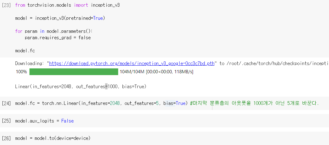 마지막으로 inception은 imagenet으로 학습했기 때문에 분류층이 1000개인데 이것을 우리에게 필요한 5개의 분류 아웃풋으로 바꿔준다.