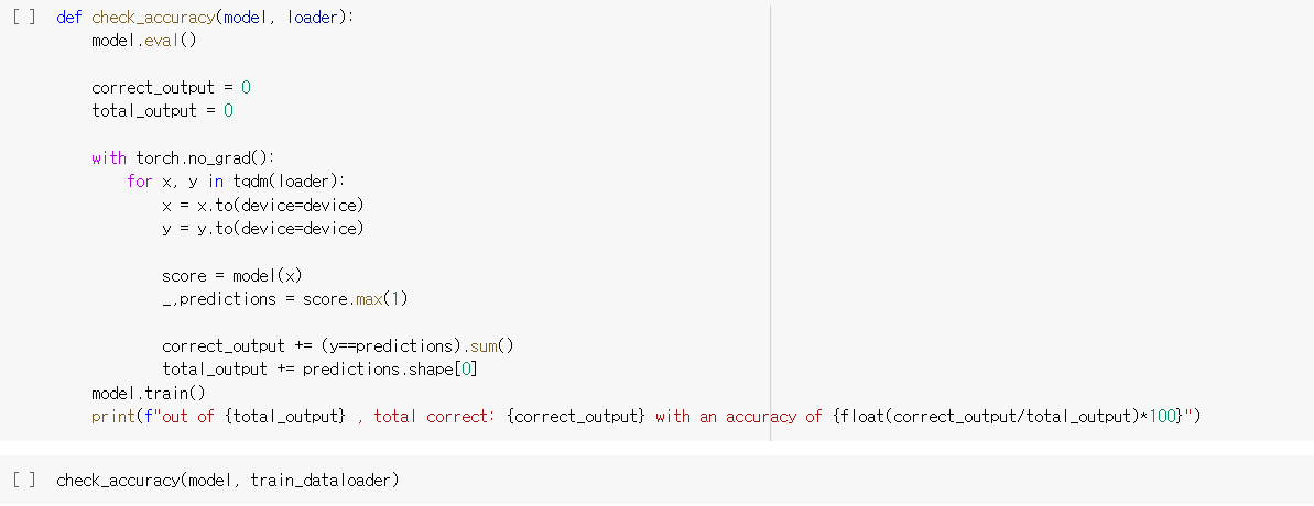 마지막으로 test 데이터셋을 평가하는 모델을 만들어서 정확도를 확인하는 함수를 만든다.
