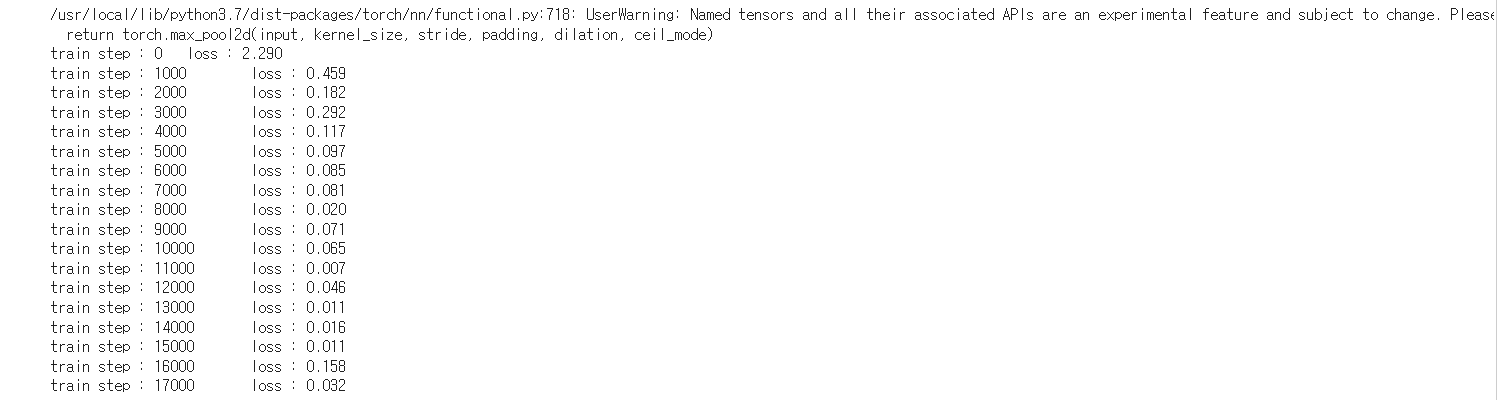그 후 forward함수에서 이 설정한 변수들을 순서대로 불러와 최종적인 output을 만든다. 마지막에 fc층이 10개인 이유는 MNIST데이터는 총 10개의 레이블로 구성되어 있기 때문이다.