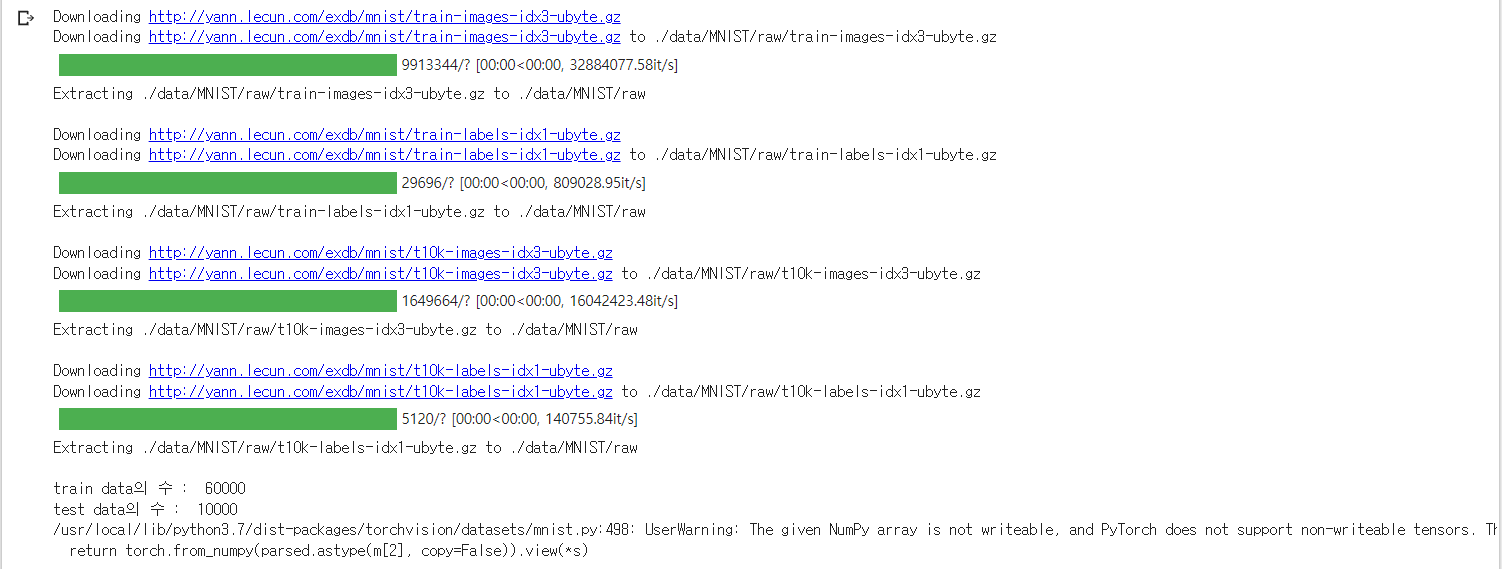 아까 torchvision에선 딥러닝 튜토리얼에 필요한 다양한 데이터셋이나 CNN 모델(VGG, googlenet 등)이 들어있다. 거기서 MNIST 데이터셋을 가져온다.
