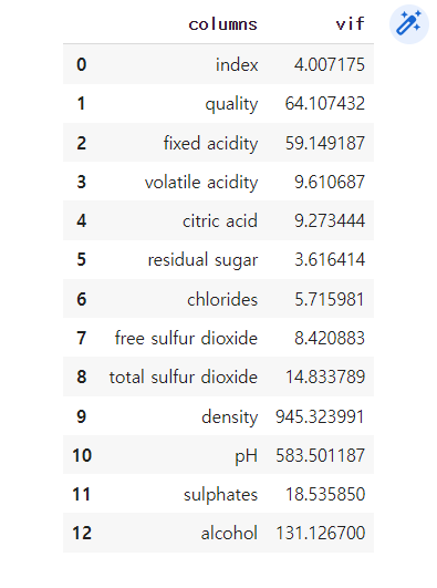 3번 vif는 variance(분산) inflation(팽창) factor(요인) 의 약자로 각 변수간의 다중공산성을 표현한다.