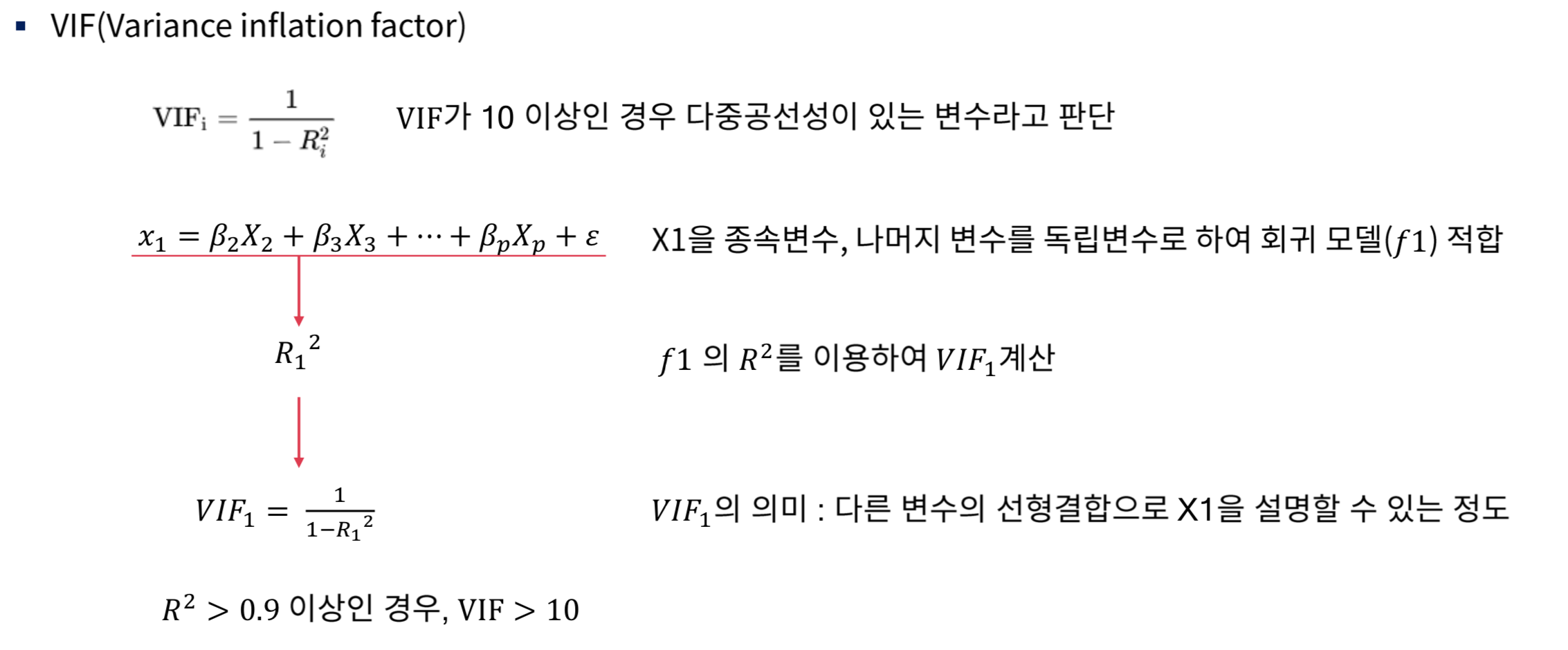 vif를 계산할 변수를 종속변수로 두고 나머지 독립변수들을 독립변수로 두어 거기에서 나온 결정계수를 활용한다.