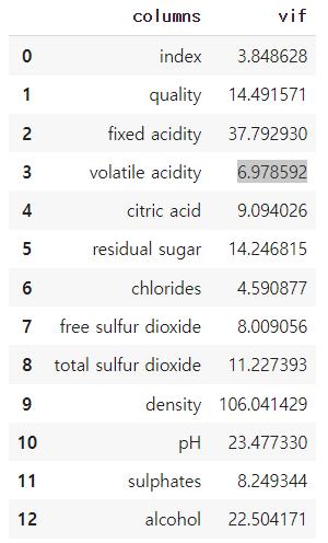 데이터의 VIF를 찾아본다. variance_inflaction_factor()함수로 train df의 값만 꺼내온 train_val array를 넣어주고, vif를 구할 변수들을 한개씩 넣어준다.(x1(index)==0, x2(quality)==1)